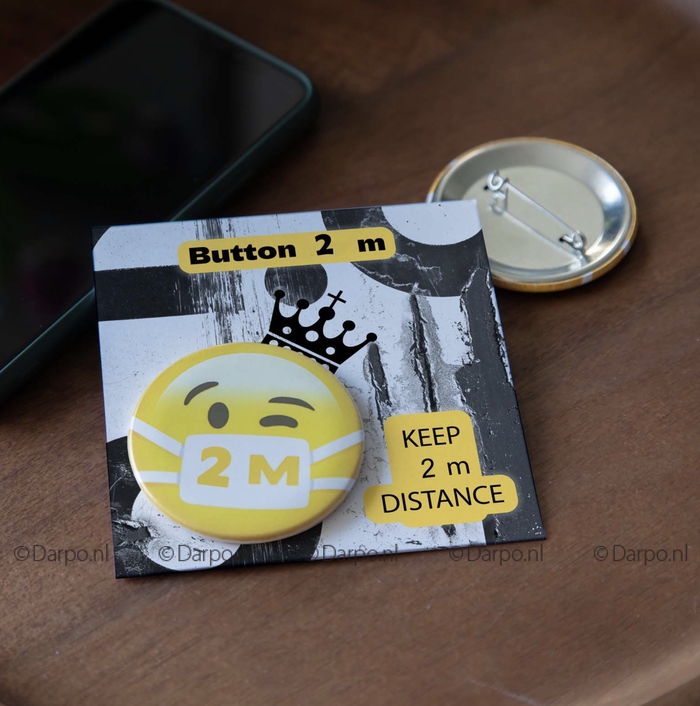 Het dragen van de 1,5 M button kan bijdragen tot bewustwording en constante attenderen op de anderhalvemeter afstand houden.